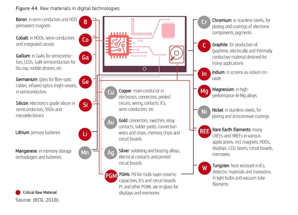 L’industrie des technologies numériques est dépendante d’une gamme d’éléments de plus en plus large, permettant d’obtenir les propriétés électroniques, magnétiques, optiques ou mécaniques souhaitées pour les puces et les dispositifs, et qui dépendent de la disponibilité de certaines matières premières. La Commission européenne a publié un rapport sur les matières premières critiques pour les technologies et secteurs stratégiques dans l’UE explicitant la sensibilité de plusieurs technologies, secteurs et chaînes d’approvisionnement à ces matières premières critiques. Cette étude montre que la consommation européenne de nombreux métaux et terres rares va augmenter d’ici à 2035, en particulier palladium, gallium, dysprosium et néodyme. Ainsi, la consommation de palladium pour les smartphones et les ordinateurs, qui représentait 12 % du stock en 2015, devrait croître à 17 % en 2035. Quant à la consommation de tantale, de 80 % de la consommation européenne pour ces mêmes usages, elle devrait atteindre 110 % en 2035. En outre, on peut estimer que le stockage de la sphère de données mondiale prévue pour 2025 nécessiterait jusqu’à 80 kilotonnes de néodyme, soit environ 120 fois la demande annuelle actuelle de ce matériau dans l’UE. L’utilisation de technologies émergentes telles que la RAM ferroélectrique nécessiterait jusqu’à 40 kilotonnes de platine, soit environ 600 fois la demande annuelle actuelle de l’UE.