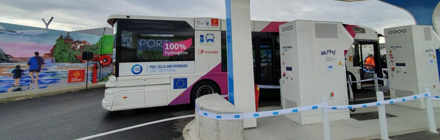 Imaginez une station-service… sans essence. À la pompe, vous obtenez de l’hydrogène renouvelable produit sur place. En janvier 2024, l’électrolyseur installé sur site sera approvisionné à 100 % en électricité renouvelable et locale, directement envoyée depuis la ferme agrivoltaïque de Fanjeaux (Aude) et les barrages hydro-électriques des Pyrénées. Cette station, située sur l’aéroport de Toulouse-Blagnac et à proximité des axes routiers, est la 1re station d’Europe de production et distribution d’hydrogène renouvelable située dans une zone aéroportuaire. Inaugurée en décembre 2023, elle produit chaque jour plus de 400 kg d’hydrogène renouvelable qu’elle distribue via deux bornes. La première, située à côté de l’aéroport, approvisionne les véhicules légers et les bus qui font la navette pour les voyageurs mais aussi les salariés d’Airbus. La seconde, installée directement sur le tarmac, rechargera les tracteurs d’avions et les groupes électrogènes utilisés pour alimenter les avions sur les pistes.