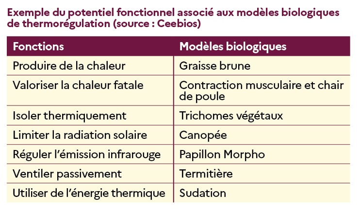 C’est en matière d’énergie que le biomimétisme peut constituer une source majeure d’inspiration. En effet, la nature sait fabriquer ou stocker de l’énergie à moindre coût, elle sait transformer efficacement l’énergie et elle réutilise tous les déchets qu’elle a créés. La thermorégulation constitue par exemple un défi pour la recherche. Or la nature peut nous fournir des exemples de processus ou stratégies réalisés par le vivant dont nos technologies pourraient s’inspirer.