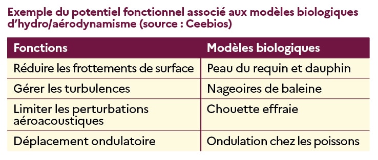 La chaleur est également la principale source de pertes énergétiques, notamment par le frottement des structures dans leur milieu fluide. Si cette contrainte énergétique est très forte, elle a conduit au cours du temps au développement d’un ensemble de stratégies d’hydrodynamisme et d’aérodynamisme visant à limiter les pertes. Transposer ces solutions vers des domaines faisant face aux mêmes contraintes environnementales ouvre alors la voie à un grand nombre d’applications potentielles comme le montre le tableau ci-dessous.