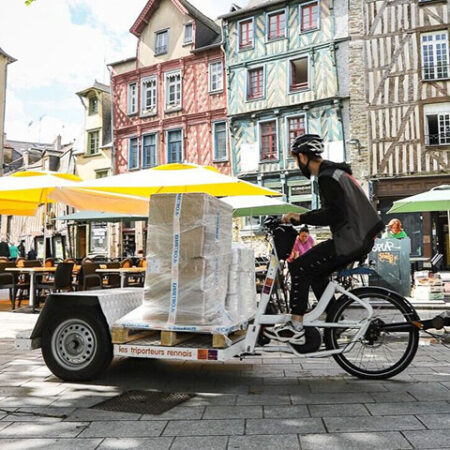 Livrer le dernier kilomètre en triporteurs, c’est possible et ça roule ! À Rennes, Les Triporteurs Français travaillent avec plusieurs entreprises de transport, ainsi que des chargeurs, pour mutualiser le fret sec et frais au cœur du centre-ville. Cela réduit de manière significative les émissions de CO2 de l’hypercentre. Le principe est simple : STEF et DB Schenker livrent en produits frais et secs un point de livraison situé dans le centre de la ville. La marchandise, destinée à des restaurateurs du centre-ville est ensuite prise en charge par Les Triporteurs Français à l’aide de vélos munis de caisses isothermes conçues par FlexiModal et K-Ryole. En moyenne, 10 tonnes de marchandises alimentaires sont livrées chaque mois pour STEF et 80 tonnes de marchandises pour DB Schenker. Une initiative saluée par le programme EVE du Trophée de la « Meilleure coopération entre acteurs » et qui fait son chemin !