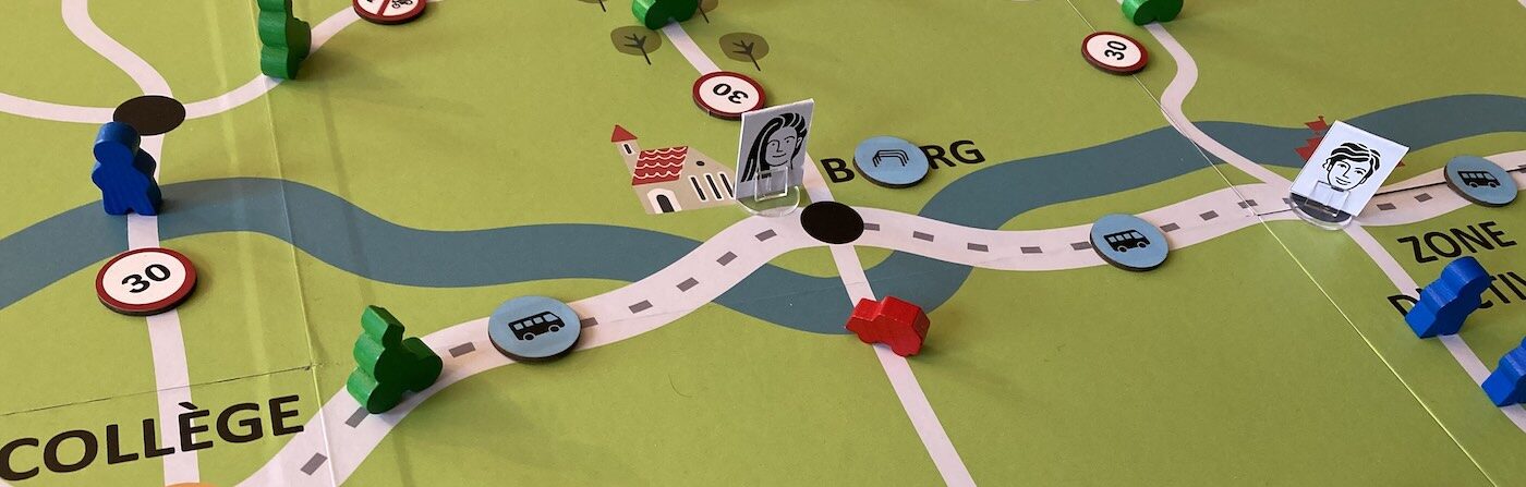 Le jeu coopératif PLAY-MOBILE fonctionne un peu sur le principe de la gestion collective de l’espace urbain. Sa particularité ? Il est destiné aux professionnels et élus urbains et concerne les zones denses. Cette fois, vous êtes élu au cadre de vie, commerçant, dirigeante d’entreprise, retraité, personne à mobilité réduite… À chaque tour, vous devez vous déplacer en voiture, en vélo, à pied ou en bus dans une section de rue pensée pour les voitures tout en faisant évoluer la configuration de la rue afin d’en limiter la congestion, la pollution, le risque d’accident et obtenir ainsi, le meilleur score. À chaque tour de nouveaux aménagements et des services de mobilité sont proposés au collectif, qui devra décider de l’application de ces mesures.